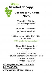 Samstag 25. und Sonntag 26. Oktober geht es endlich weiter. Unsere Weinstube ist wieder ab 14 Uhr geöffnet.